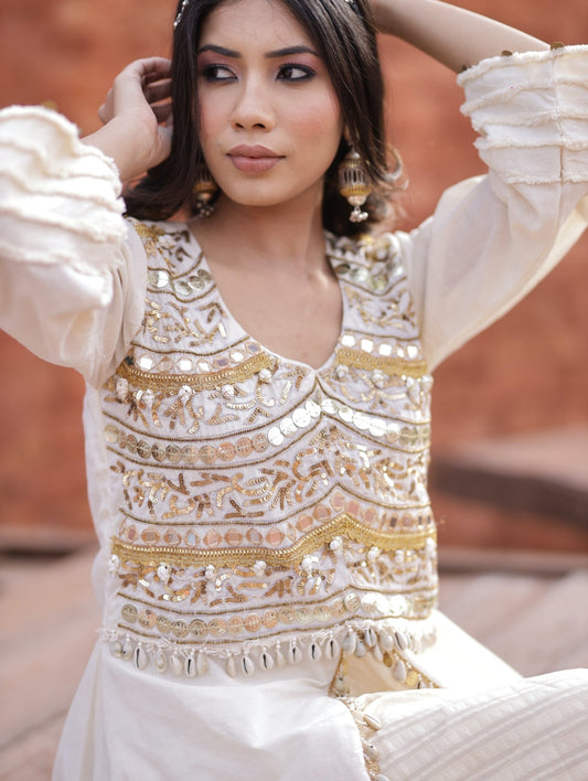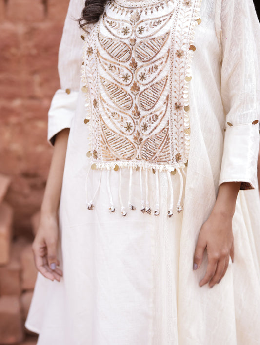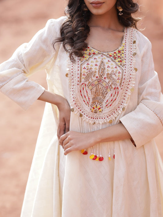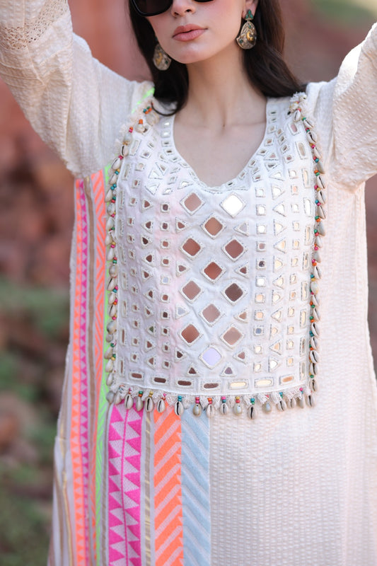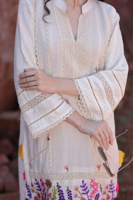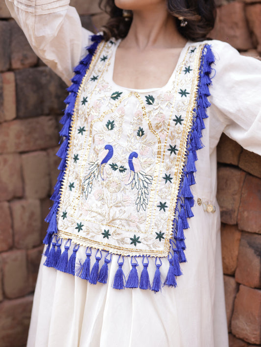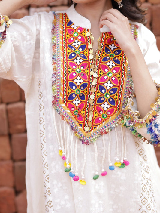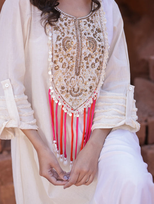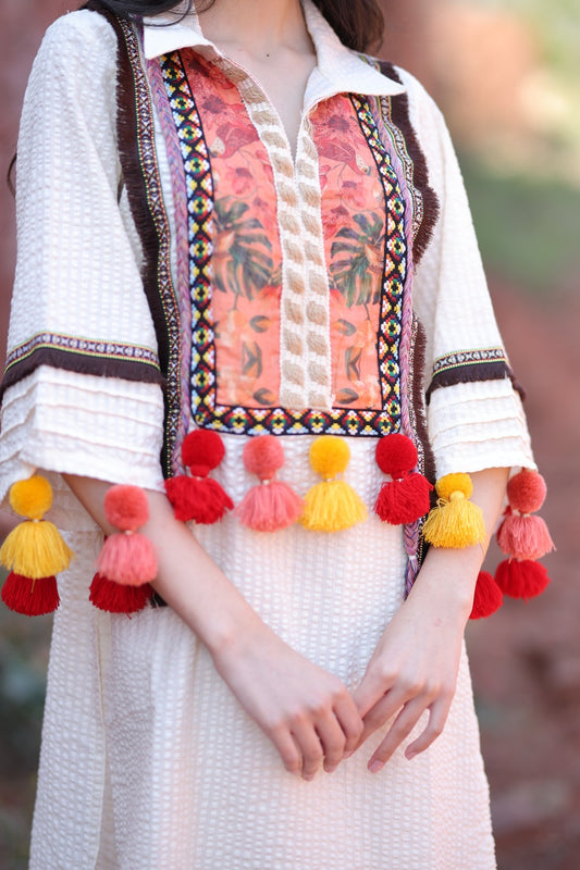 Boho Styled Ivory Embroidered Kurta with Tassels