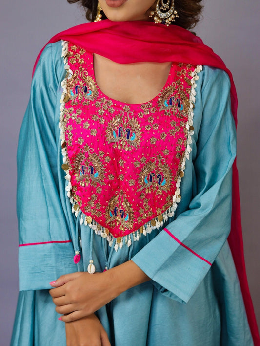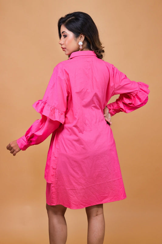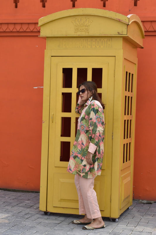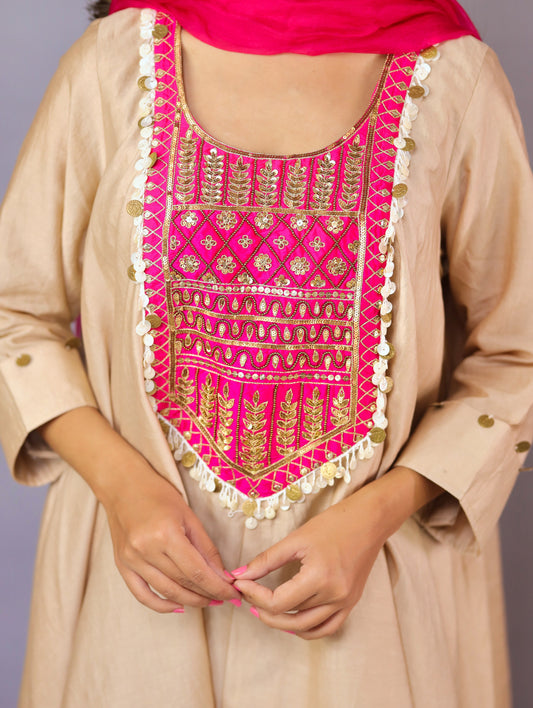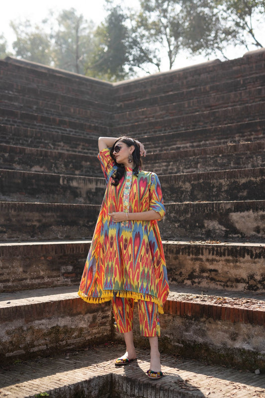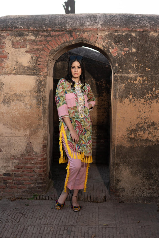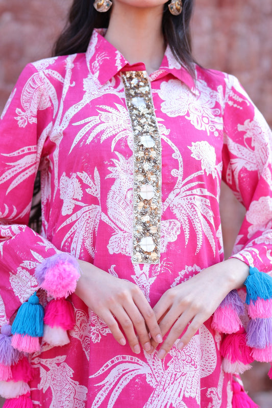 Tropical Pink Kurta Set with Mirror Placket & Multicolour Tassels