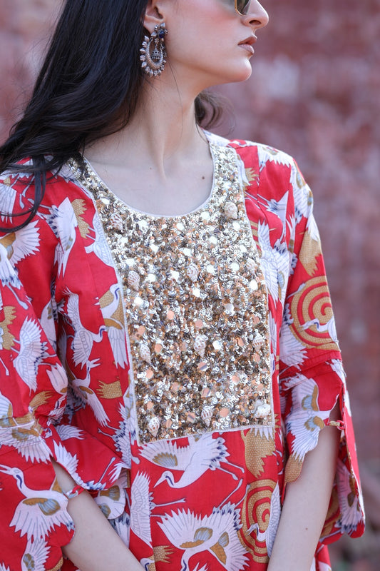 Red Bird Print Kurta Set with Mirror Yoke & Tassel Hem