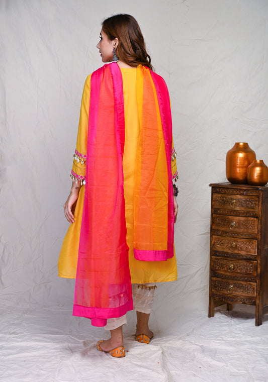 Yellow Kurta With Matching Dupatta & White Pants In Organza Having Gotta Work