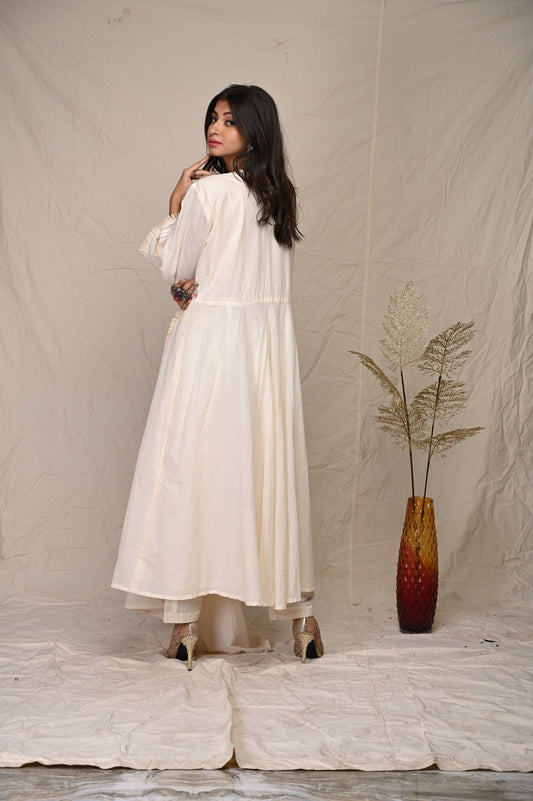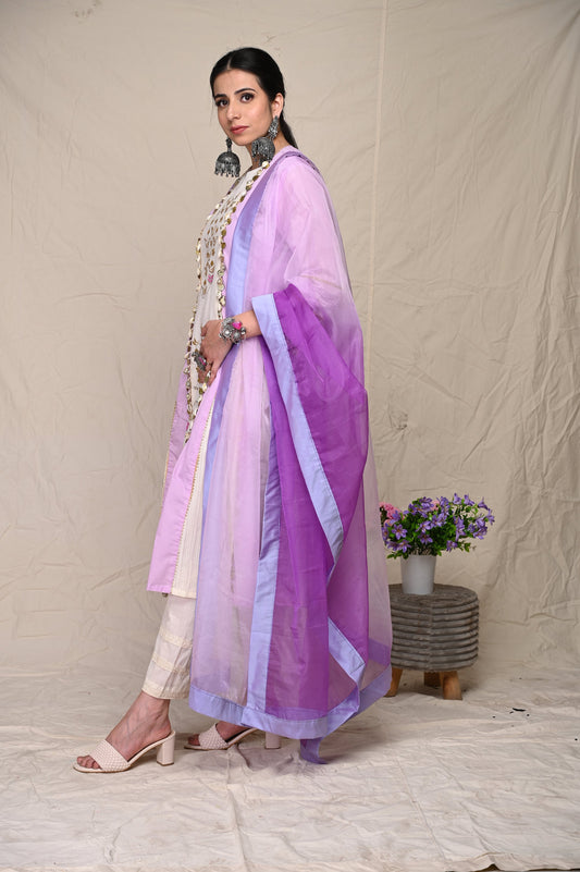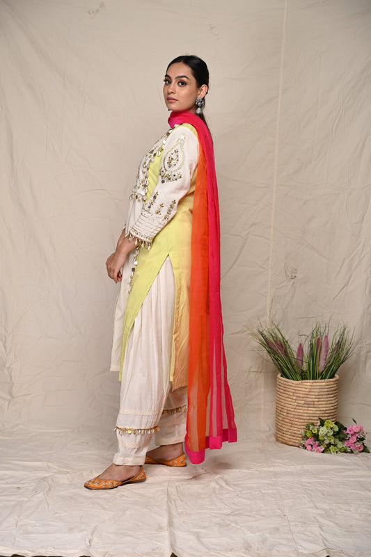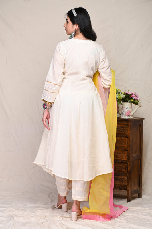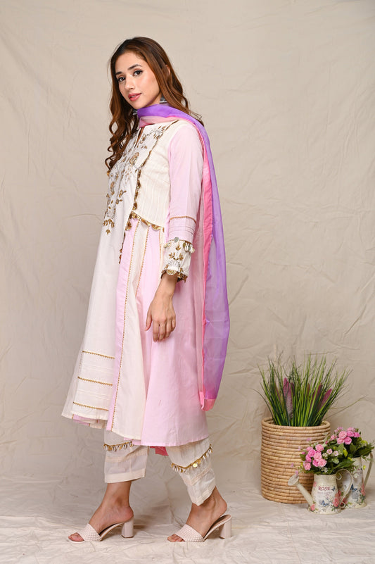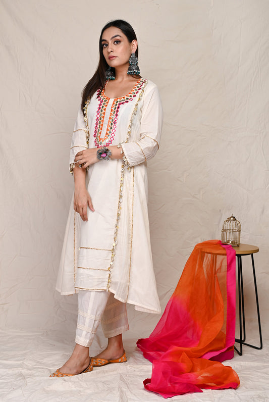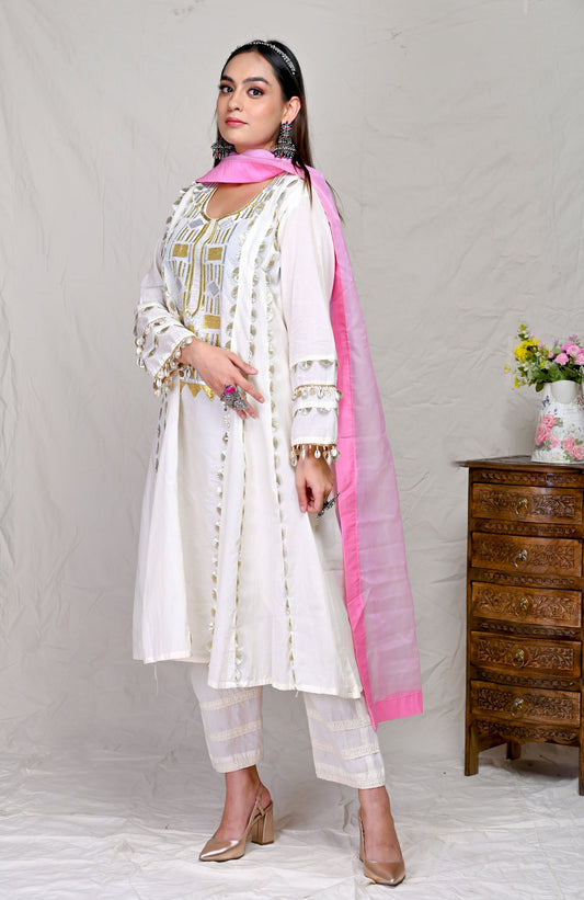 Gotta Embroidery Ivory White Indian Wear Kurta Set With Pink Dupatta