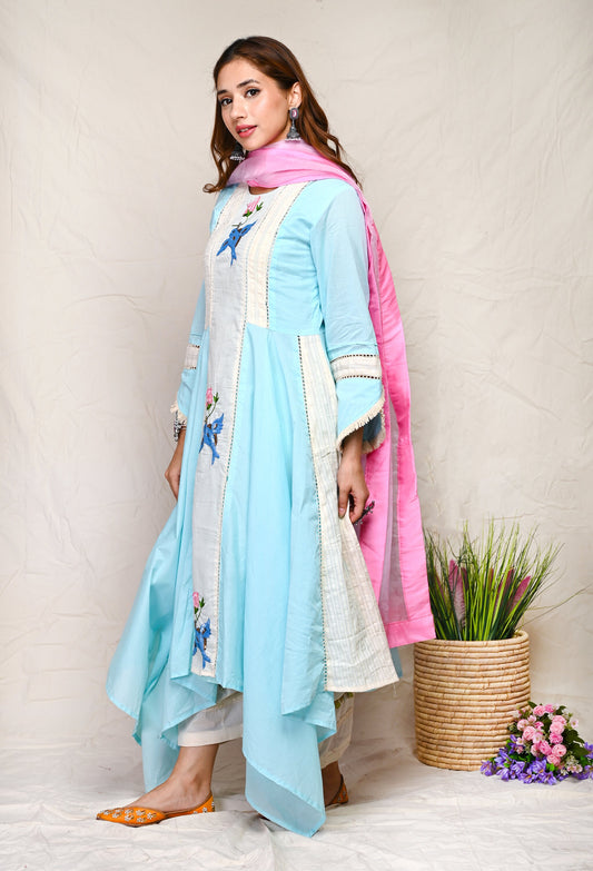 Turquoise Cotton Sequence Pattern Kurta Set With Dupatta