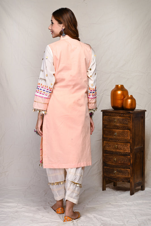 Pink Mirror Work Pattern Kurta Set (Set Of 2)