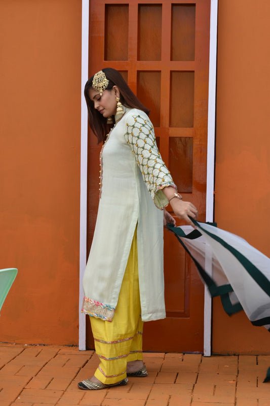 Green Kurta & Dupatta With Yellow Trousers Having Stone & Bead Work