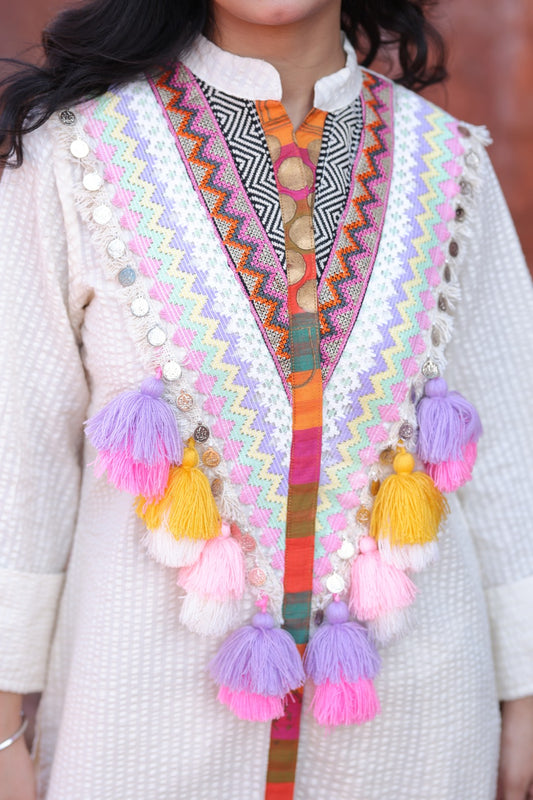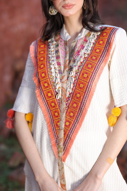 Ivory Textured Kurta with Multicolor Tassel Embroidery