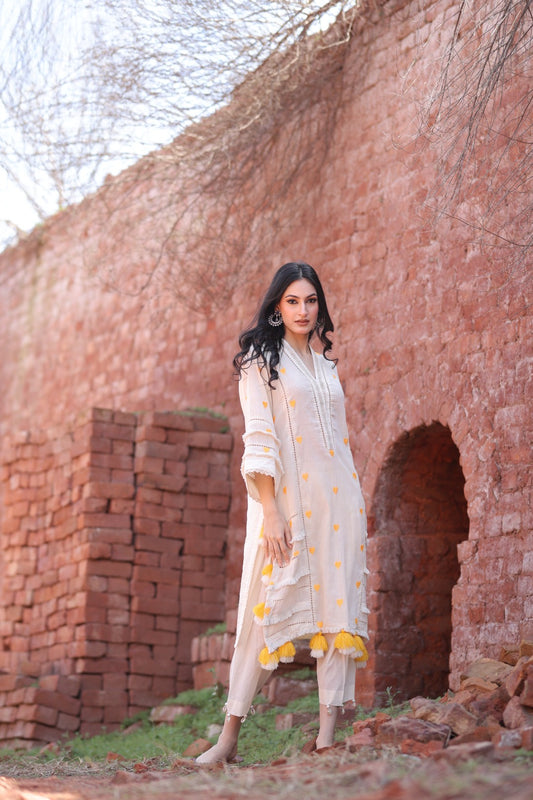 Saanjh Kurta Set – Ivory & Mustard Tassel Edit