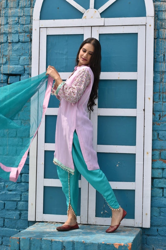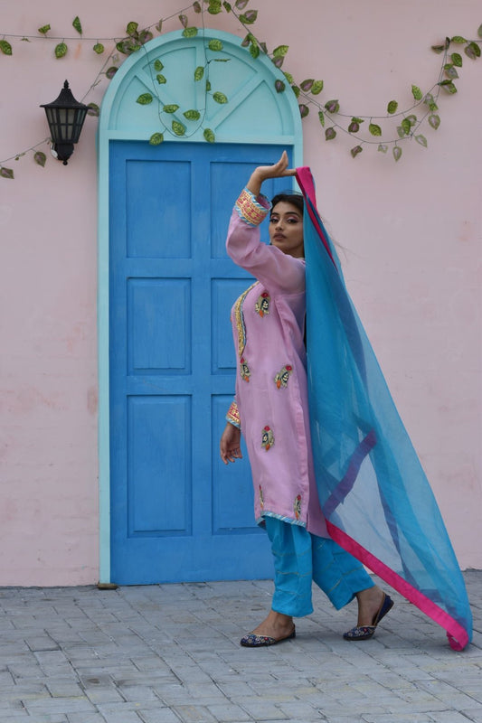 Pink Kurta With Intricate Embroidery, Blue Pants & Dupatta In Organza