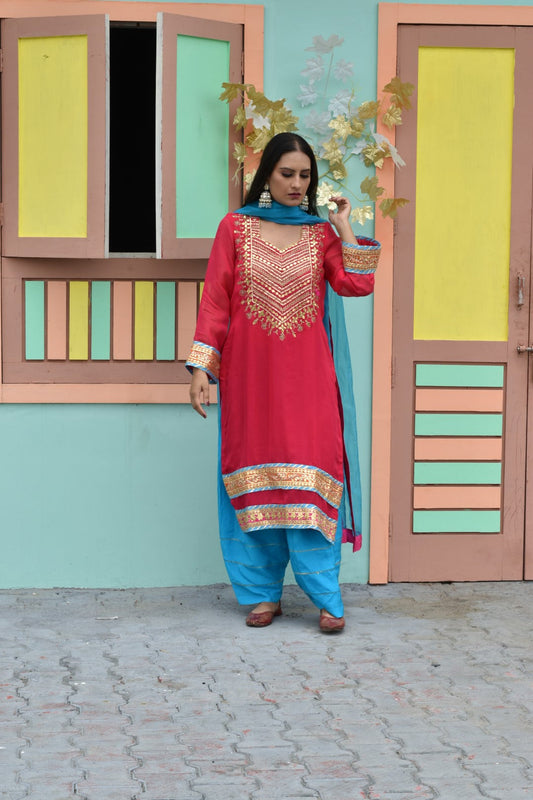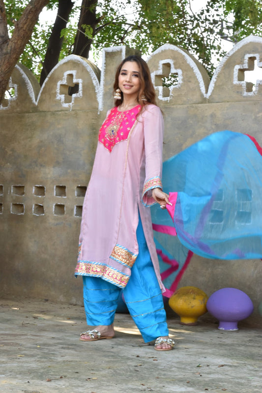 Pink Kurta, Blue Salwar & Blue Dupatta In Organza Having Gotta Work