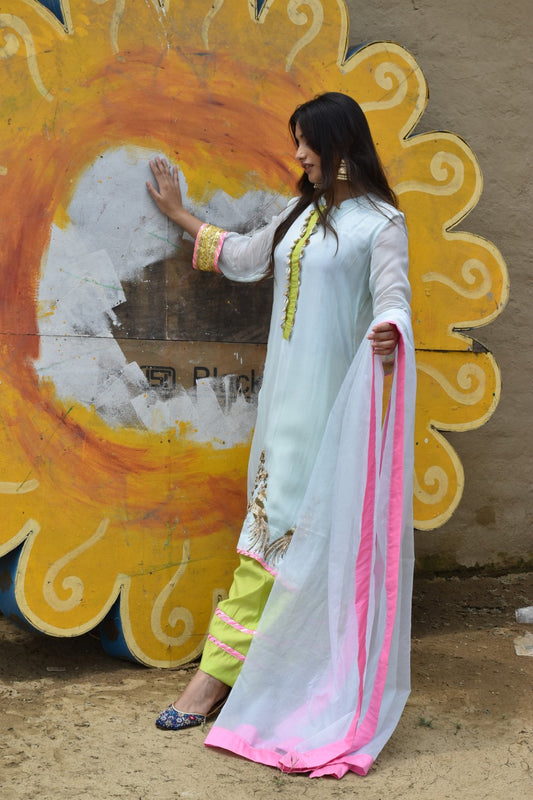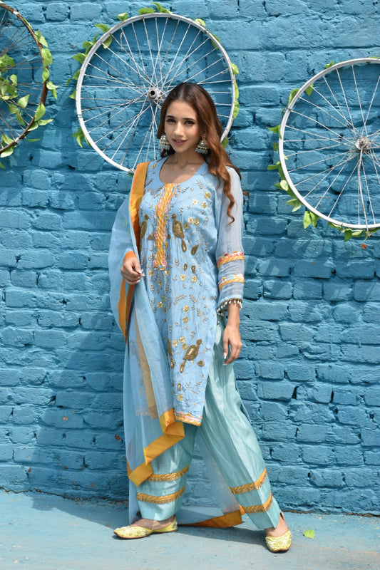 Sky Blue Kurta, Pants & Dupatta In Organza Having Zardozi Work