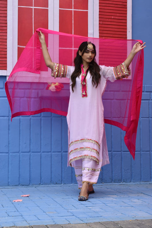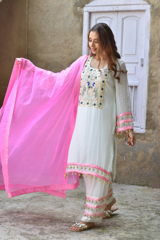 White Kurta, Pants & Baby Pink Dupatta In Organza Having Gota Work