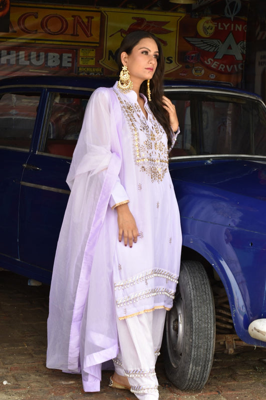 Liliac Kurta, With Blue Pants & Dupatta In Organza Having Peral N Stones Work