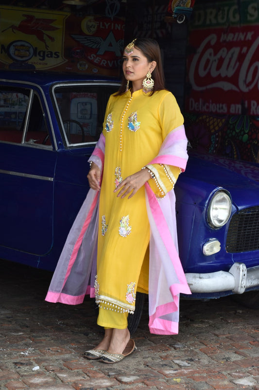 Yellow Kurta, Pants & With Pink Dupatta In Organza Having Gotta Work