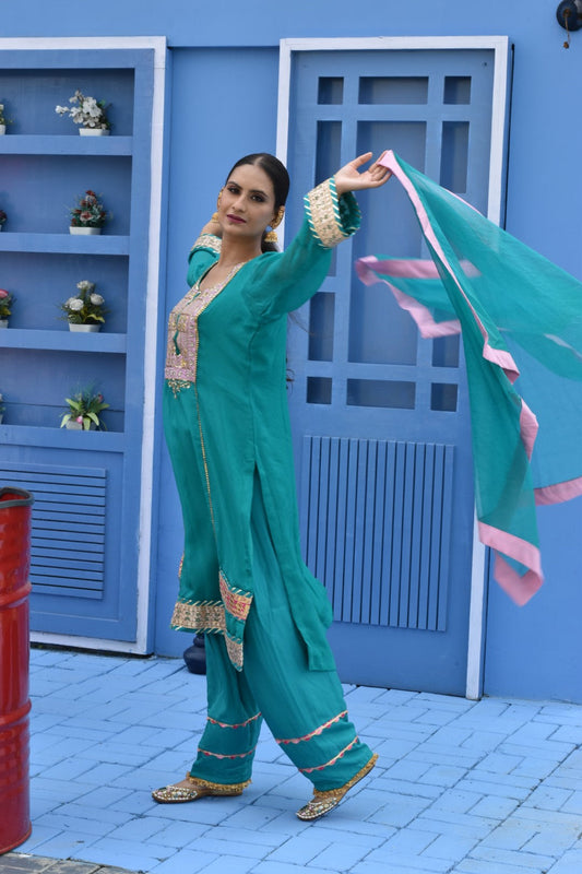 Teal Kurta, Pants & Dupatta In Organza Having Gota Work