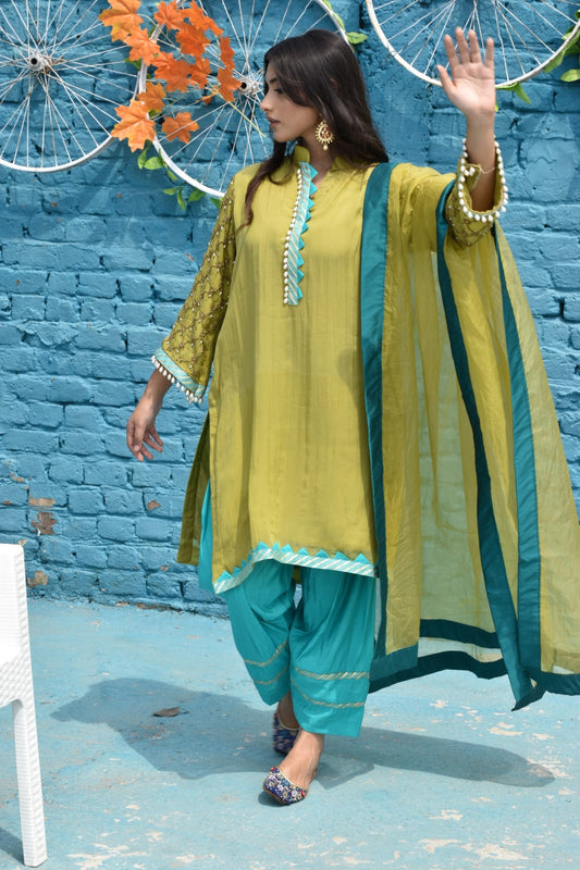 Olive Chikankari Kurta Set with Shell Yoke & Multicolour Tassels